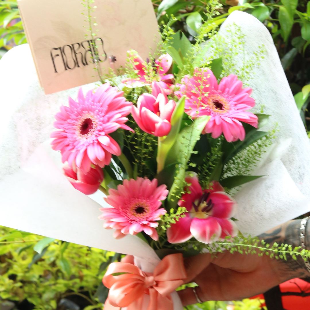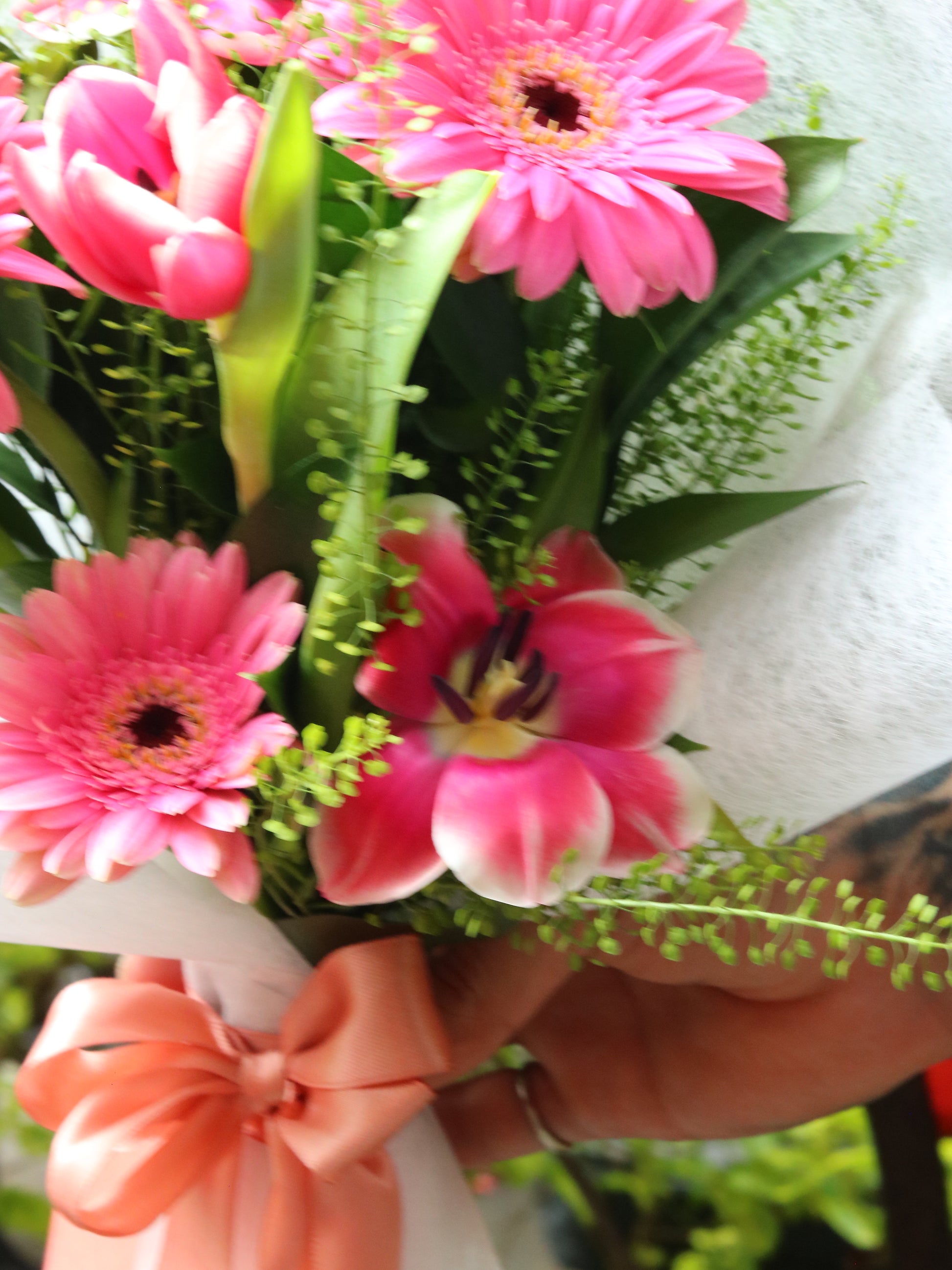 Bouquet con 4 gerberas y 3 tulipanes, acompañado de follajes.