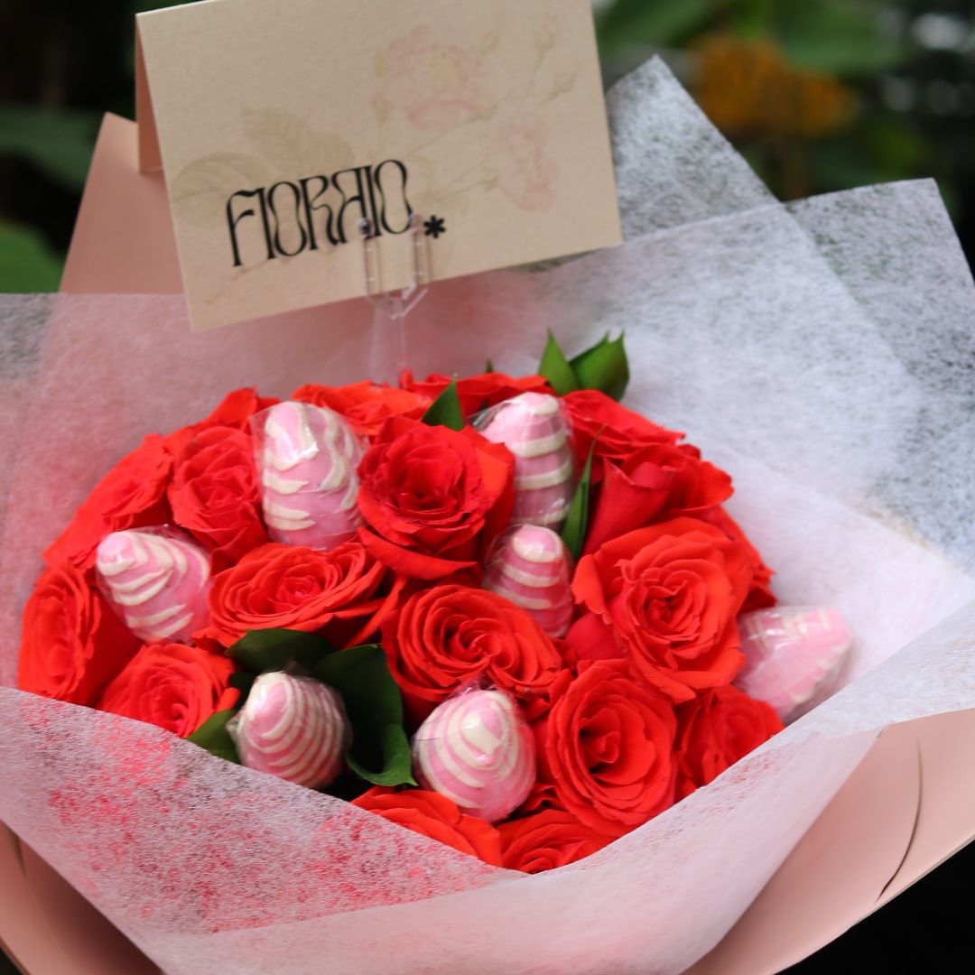 Bouquet de 24 rosas con 7 fresas cubiertas de chocolates.