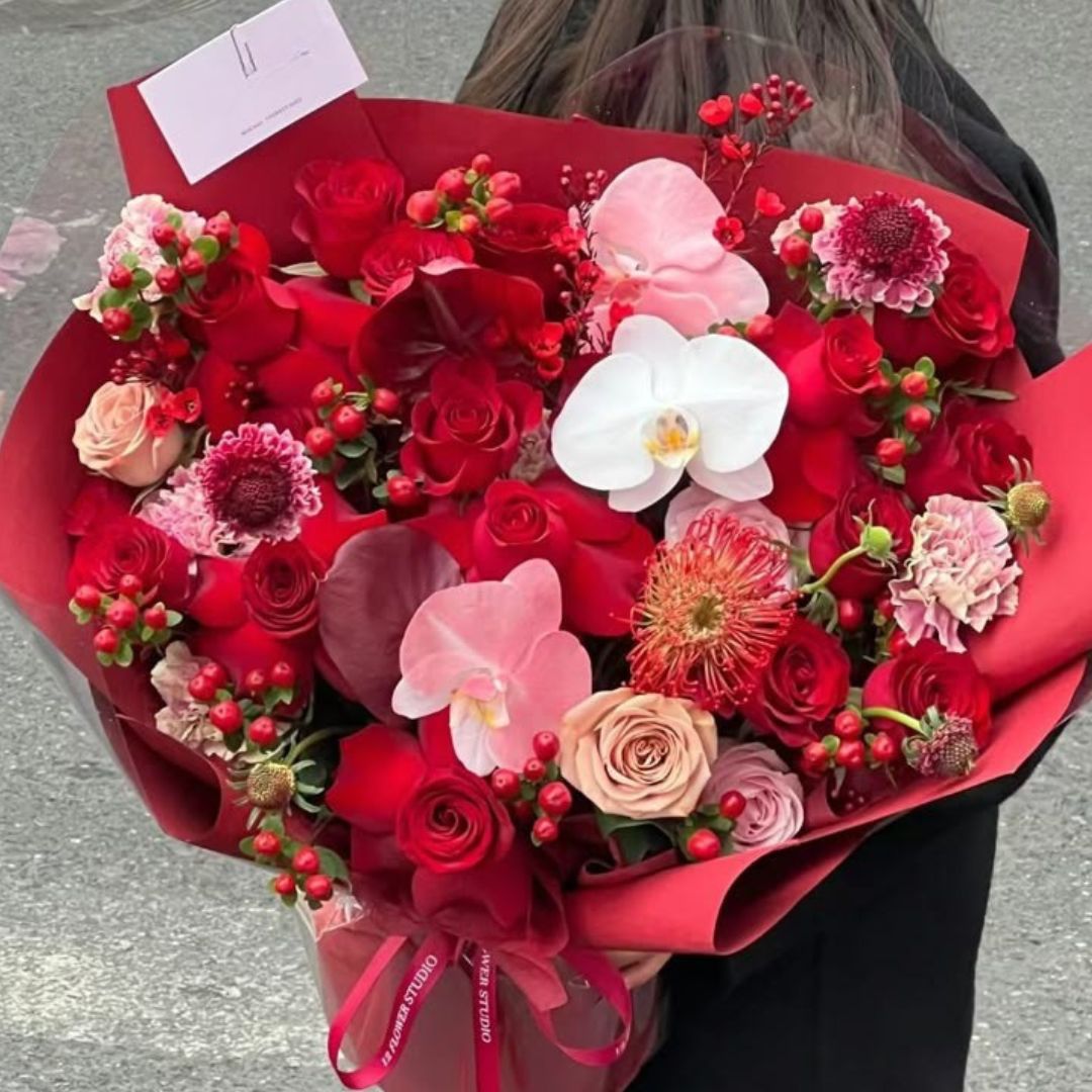 Bouquet con 50 tallos de rosas , orquideas, follajes y escabiosa