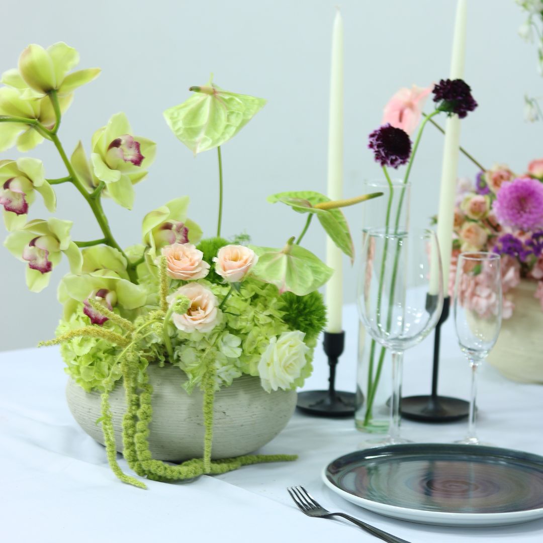 Composicion floral con orquìdeas, rosas y anturios, en base de ceramica